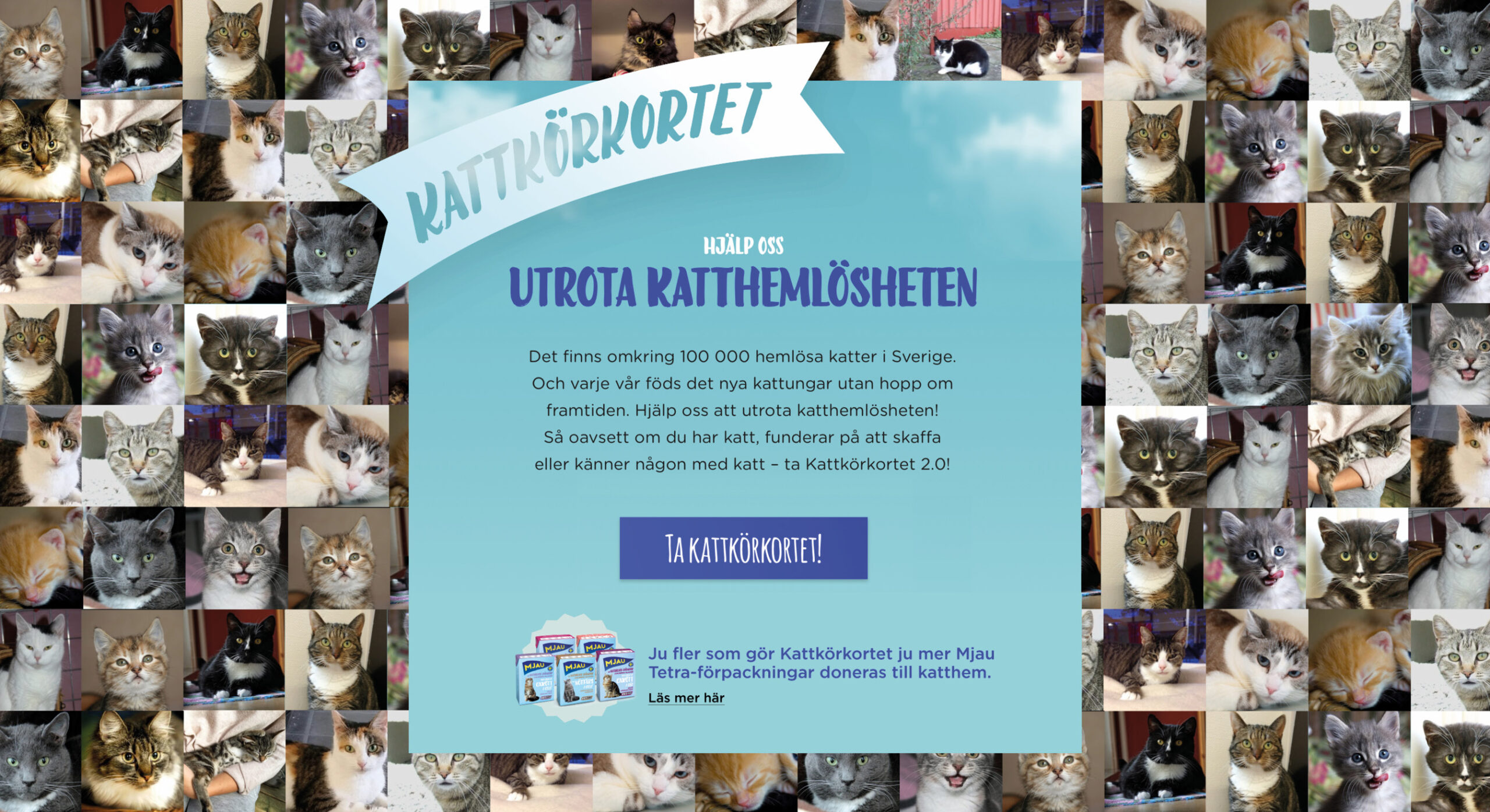 I Sverige kan vem som helst kan skaffa katt, även om långt ifrån alla är lämpade. Med Kattkörkortet slog vi ett slag för alla katters rätt till ett drägligt liv och lyckades positionera Mjau som det mest omtänksamma och ansvarstagande alternativet på kattmatsmarknaden. Hittills har hela 47.000 svenskar tagit ett kattkörkort. Om du någon gång ska sälja en katt så vet du vad du ska fråga efter.